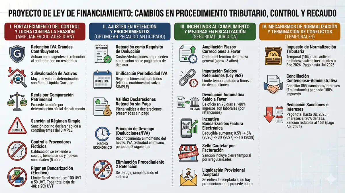 Esta categoría incluye medidas destinadas a ampliar las facultades de la DIAN, asegurar la retención en la fuente y cerrar vacíos normativos que facilitan la evasión.